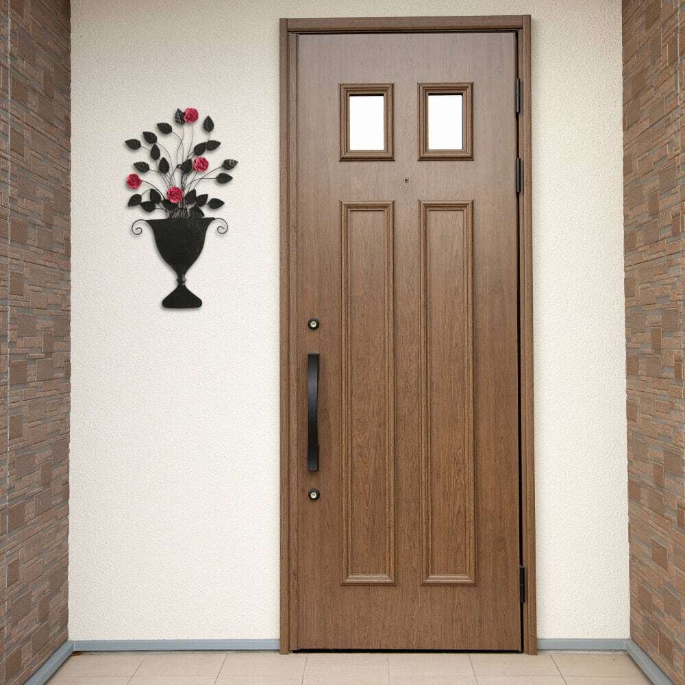 正面は花の壁飾りで、家の印象をきちんと整える。