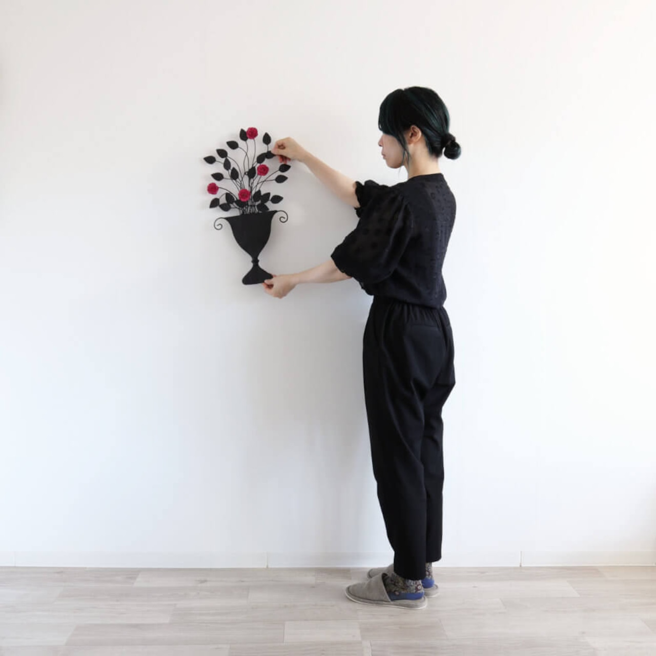 横は花瓶ウォールで、さりげなく花を飾って完成感を出す。