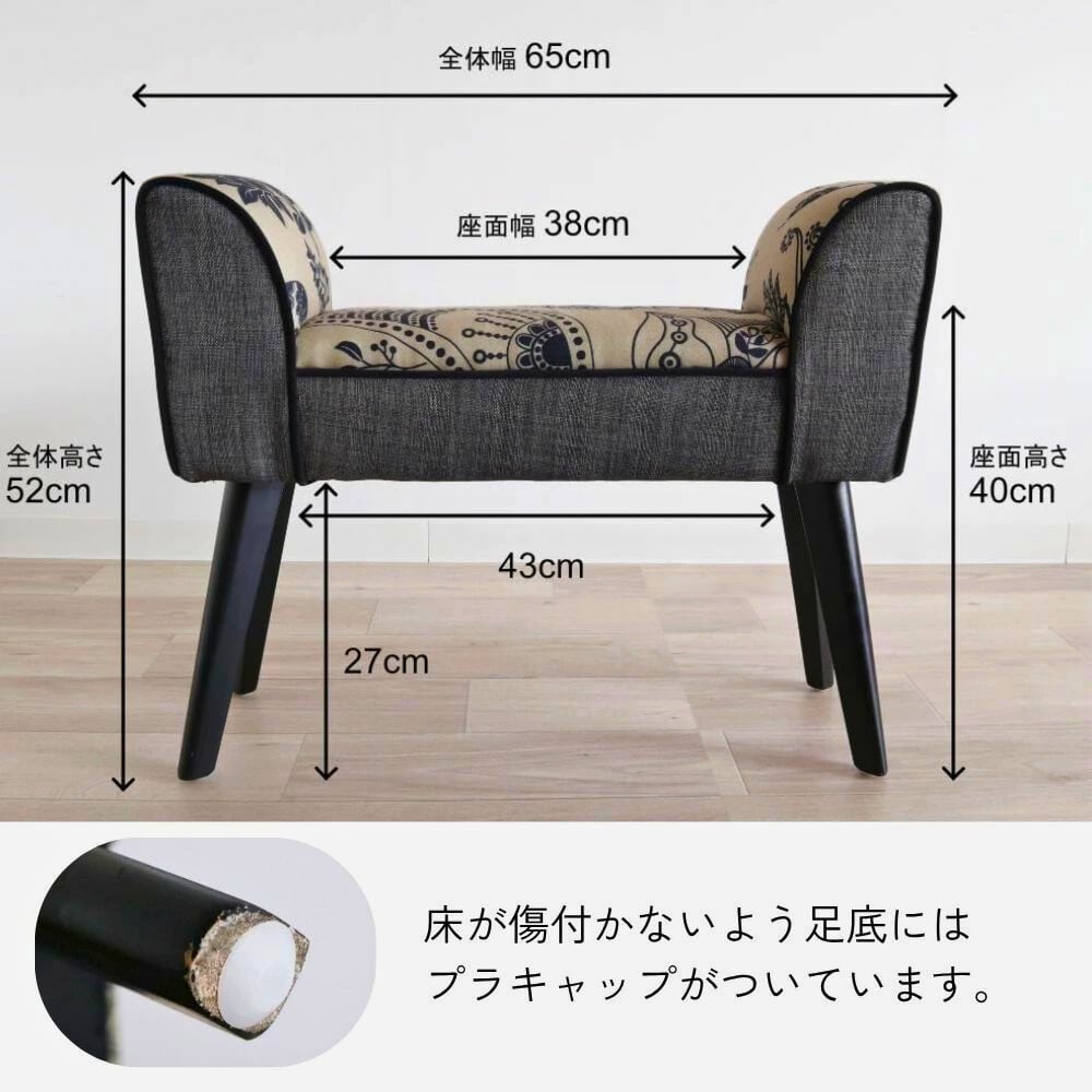 【玄関チェア】幅65cm×高さ52cm×奥行22cm/座面:幅38cm・高さ40cm/重さ3.5kg/素材:木材(足部分)、モケット地布(座面部分)