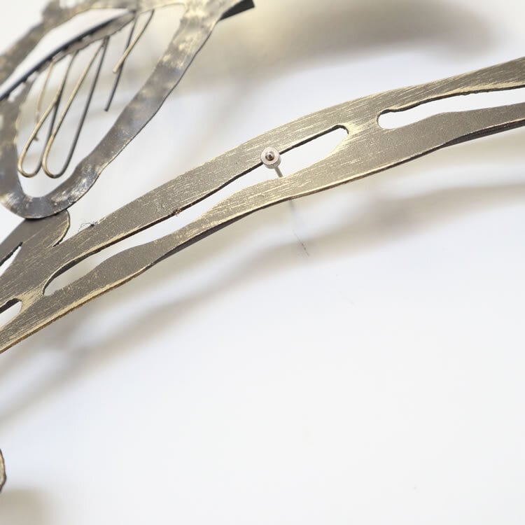 シルバーを基調に、ほんのりゴールドが混ざった色合いで、白系の壁に掛けるとラインと陰影がきれいに映えます。