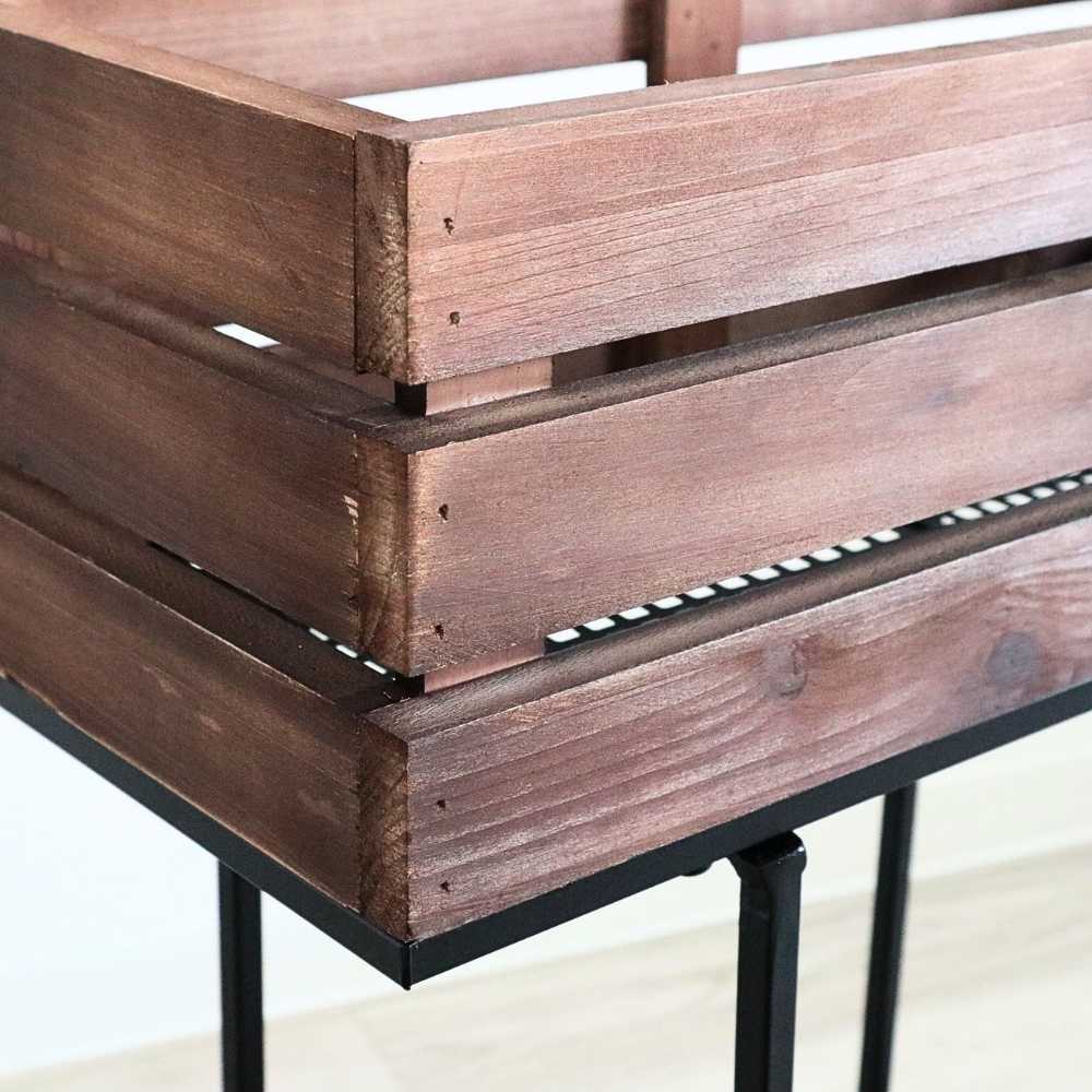上段の木製ボックスには鉢やグリーンをまとめて飾りやすく、
