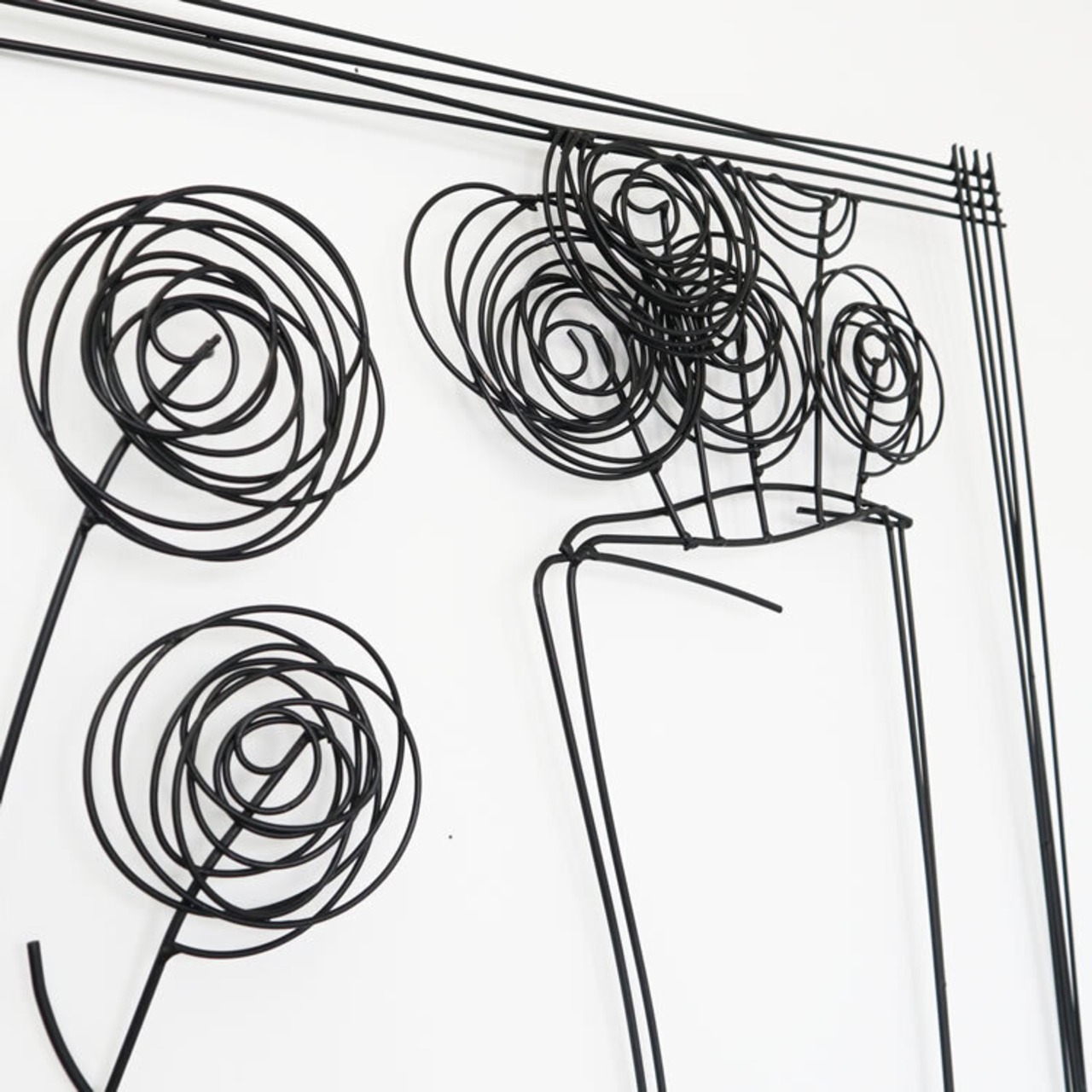 線画のように描かれたアイアンフレームのフラワーアートが、空間に軽やかな華やぎをプラスしてくれます。